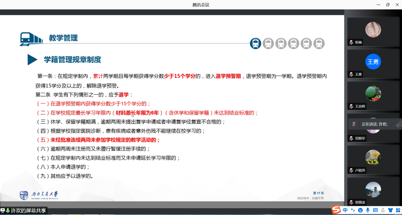 另外,许欢老师还解读了校院两级本科生管理的重要规章制度,确保各位班主任能够了解学籍管理、奖学金评定、新生晚自习等工作制度,并在工作中能高效合理开展工作。许欢老师还向大家介绍了今年的迎新系列活动安排,并结合今年疫情防控常态化工作要求,向老师们讲解了员工发热或疑似症状处置流程、体温每日三测三报、寝室晚点名、请销假等日常管理规定,着重提醒老师们做好疫情防控形势下的员工教育工作,梳理了近期重点工作清单,提醒老师们做好寝室走访、第一次班会等工作。
