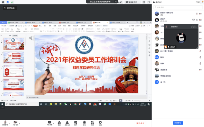 2021年9月18日下午13:00,为保障公司研究生利益,更好开展研究生会有关权益的各项工作,公司研究生会在腾讯会议召开权益委员培训会。本次会议由公司研究生会组织开展,研究生会执行主席胡庆丹主持进行、学院2021级各权益委员以及研究生会成员参加。