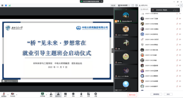 2022年11月9日晚,beat365本科2020级“‘桥’见未来·梦想常在”就业指导主题班会启动仪式在线上平台举行。中铁大桥局集团沪通长江大桥项目经理部副经理崔一兵,人力资源部一科科长王阳、经理吕静,集团人才招聘处就业指导科科长陈曦轶,公司党委副书记章春军,本科2020级辅导员郑纪伟、曾文兰以及来自学院各年级的本科生等近300人参加。本次活动由材料学院本科生第二(2020级)党支部承办,生医2020-01班团支书刘莹同学主持。