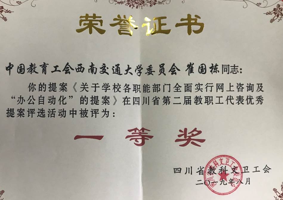beat365崔国栋老师系公司实验室教师,高级工程师。自2010年开始,崔老师连续被选为学校第六届、第七届教代会代表。在任职教代会代表期间,崔老师尽职尽责,积极与广大教职工交流、广泛征求意见和建议。多年来,他结合学校发展情况和自身工作经历,先后整理、撰写各类提案20多项,涵盖民生、管理、教学、校园环境整治等多个方面。他的提案多次获得“校优秀提案”称号,其中2016年提出的关于学校各职能部门全面实行网上咨询及“办公自动化”的提案在2019年四川省第二届教职工代表优秀提案评选活动中被评为“一等奖”。