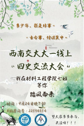 结合新生入学教育相关要求,促进新生适应老员工活、引导新生成长发展,全面提高综合素质,以班级团支部为单位自行组织学习“四史”相关知识后,开展“四史”故事我来讲主题演讲比赛(主题团日活动),各班级团支部全员参与、全程网络直播,脱稿演讲(可使用PPT辅助,每页不超过20个字),每人限时3-4分钟。每个班级推选3名表现优异的同学参加第三阶段的全年级评比活动。