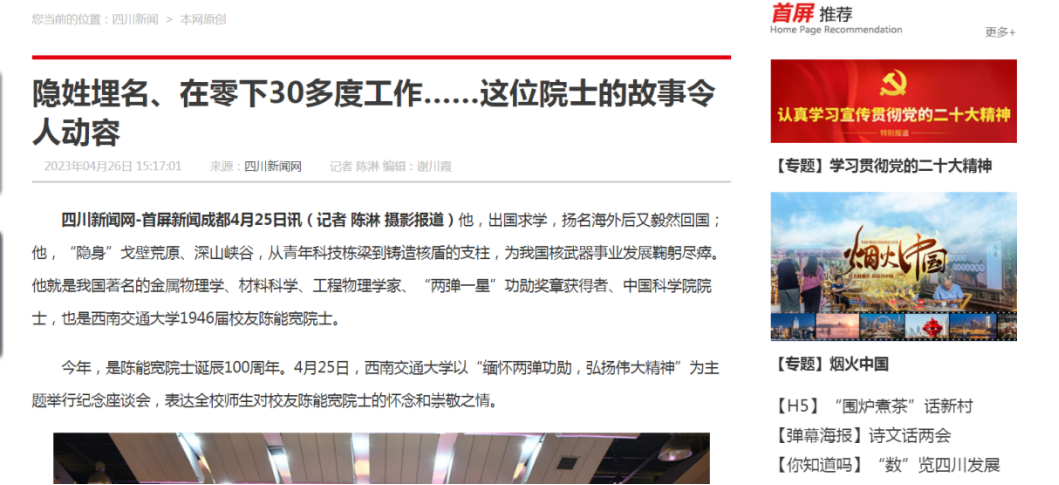科学网:缅怀两弹功勋 一场特殊的纪念会在西南交大举行https://news.sciencenet.cn/htmlnews/2023/4/499468.shtm