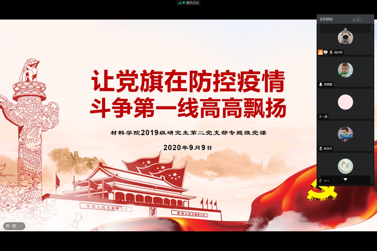 2020年9月9日晚上7:30,由于疫情影响本次组织生活会在腾讯会议上召开,会议由周丹彤同志主持。本次会议同志们进行了关于“让党旗在防控疫情,斗争第一线高高飘扬”专题微党课的学习。
